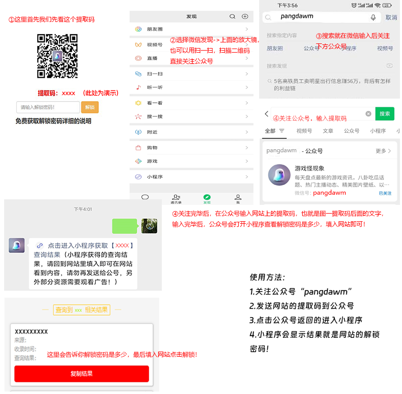 操作说明:微信点击右上角放大镜 搜索 “pangdawm” 或 微信扫一扫右上方二维码关注游戏怪现象,发送资源提取码 “ AAEw ” ,然后将公众号返回的密码输入到上方即可免费解锁!